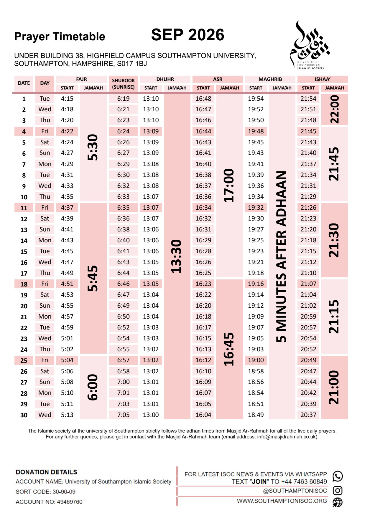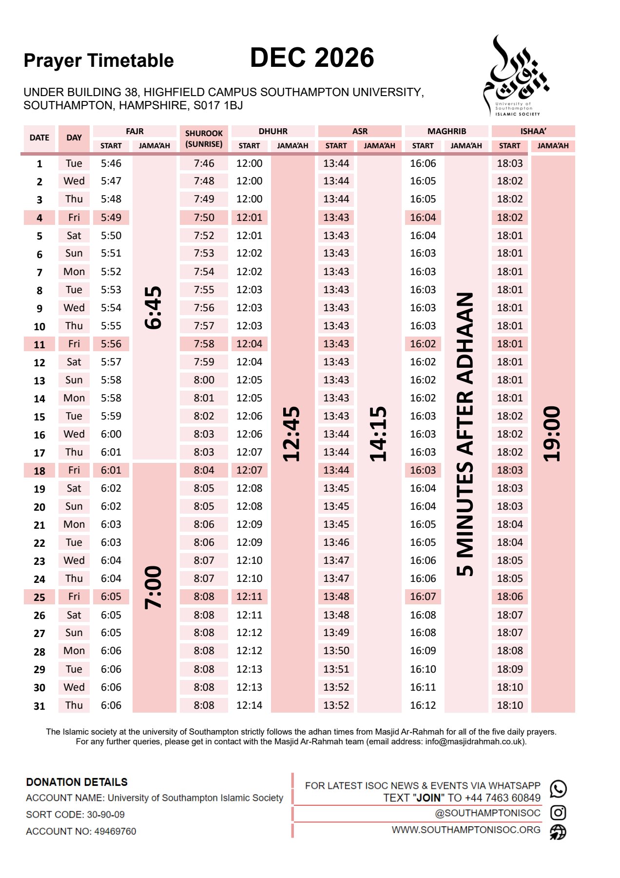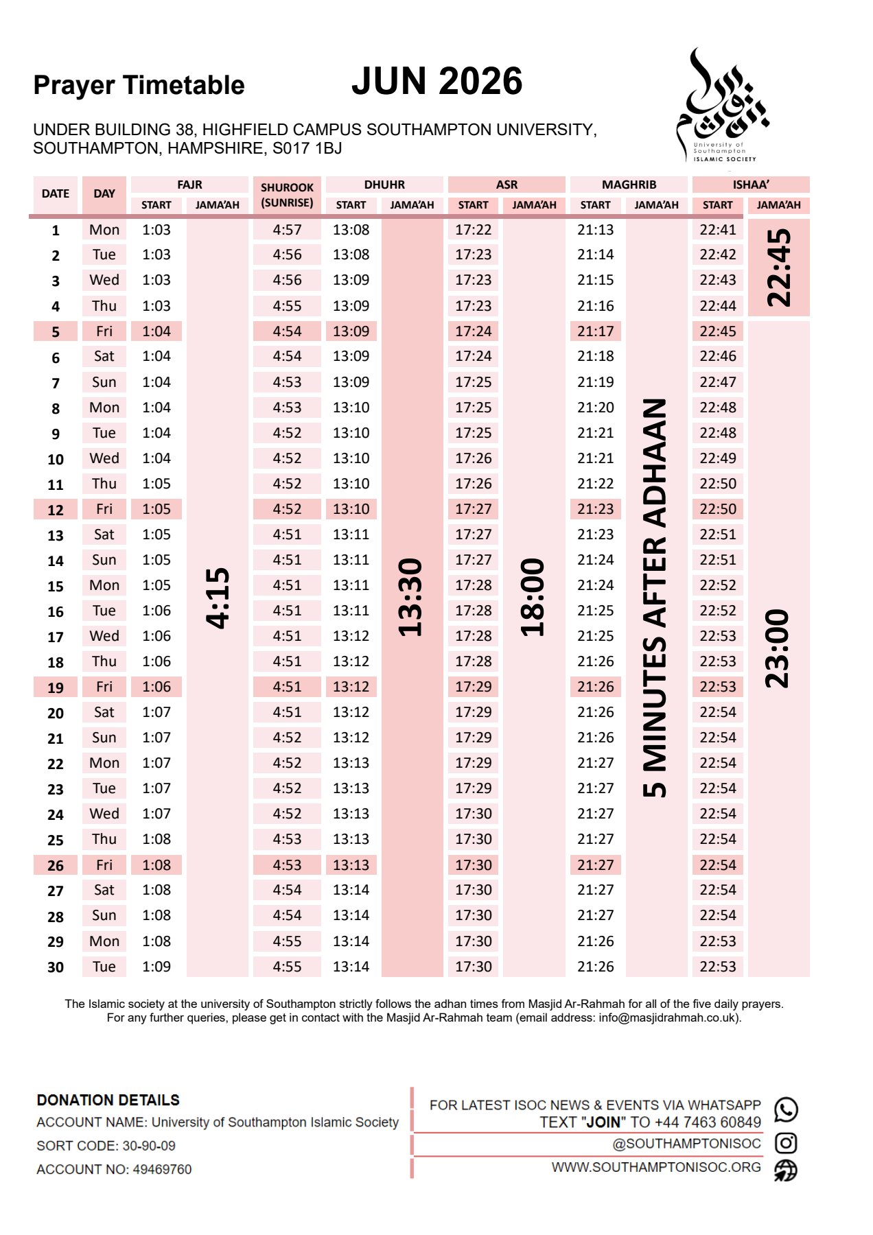 and also broadcast it via WhatsApp. So, the best way to stay up to date with the prayer timetable is to join our WhatsApp. Details are also noted on the image.