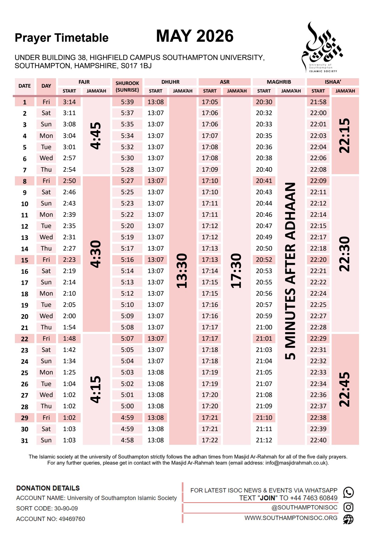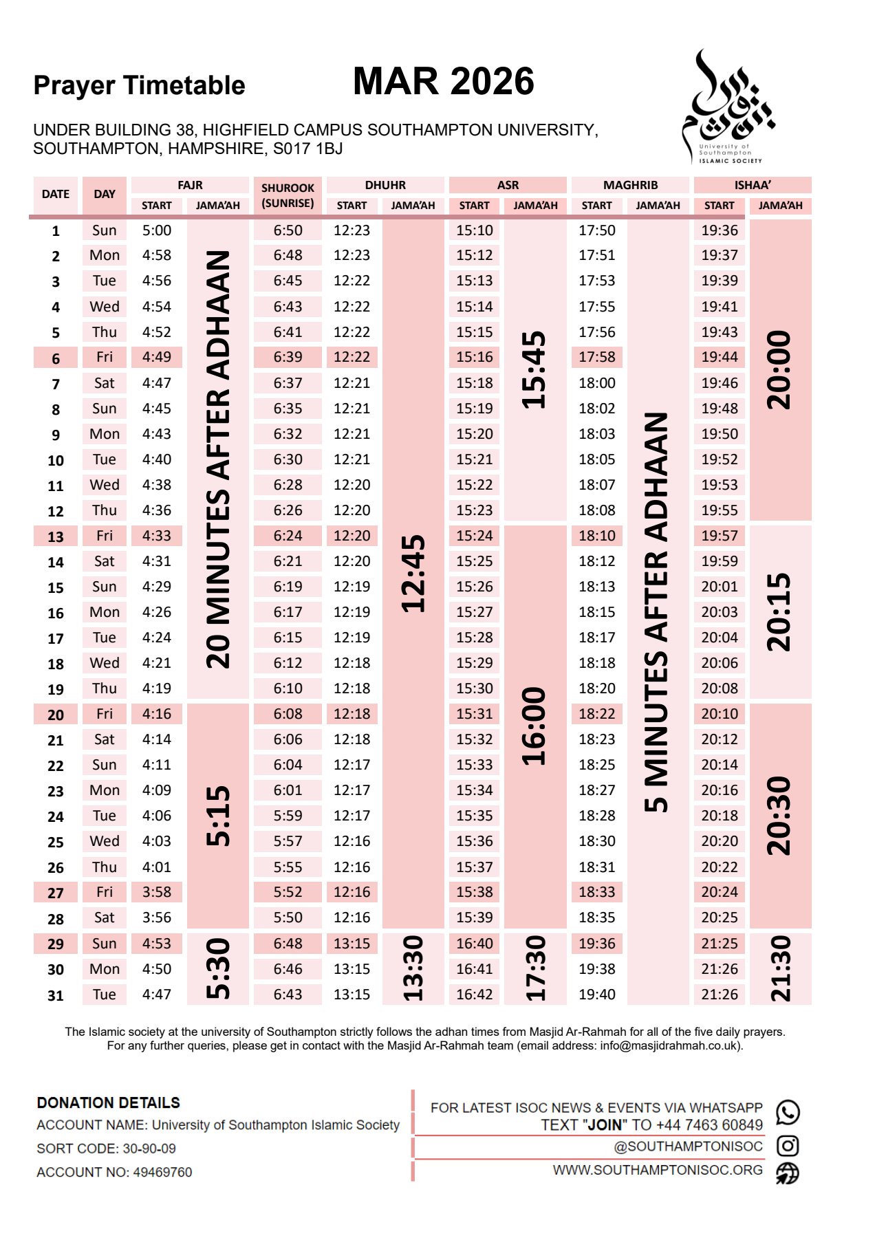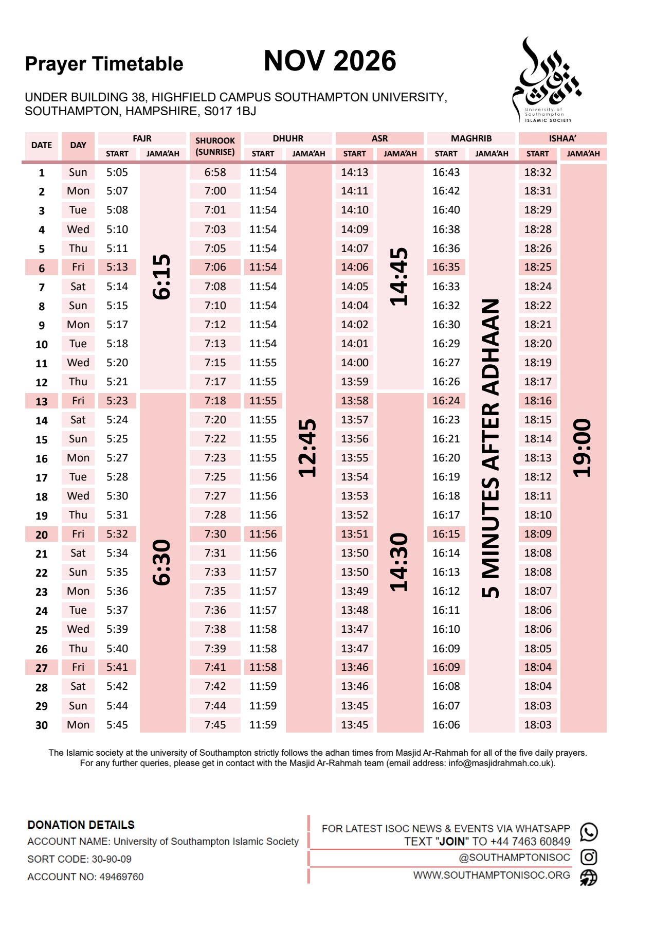 and also broadcast it via WhatsApp. So, the best way to stay up to date with the prayer timetable is to join our WhatsApp. Details are also noted on the image.